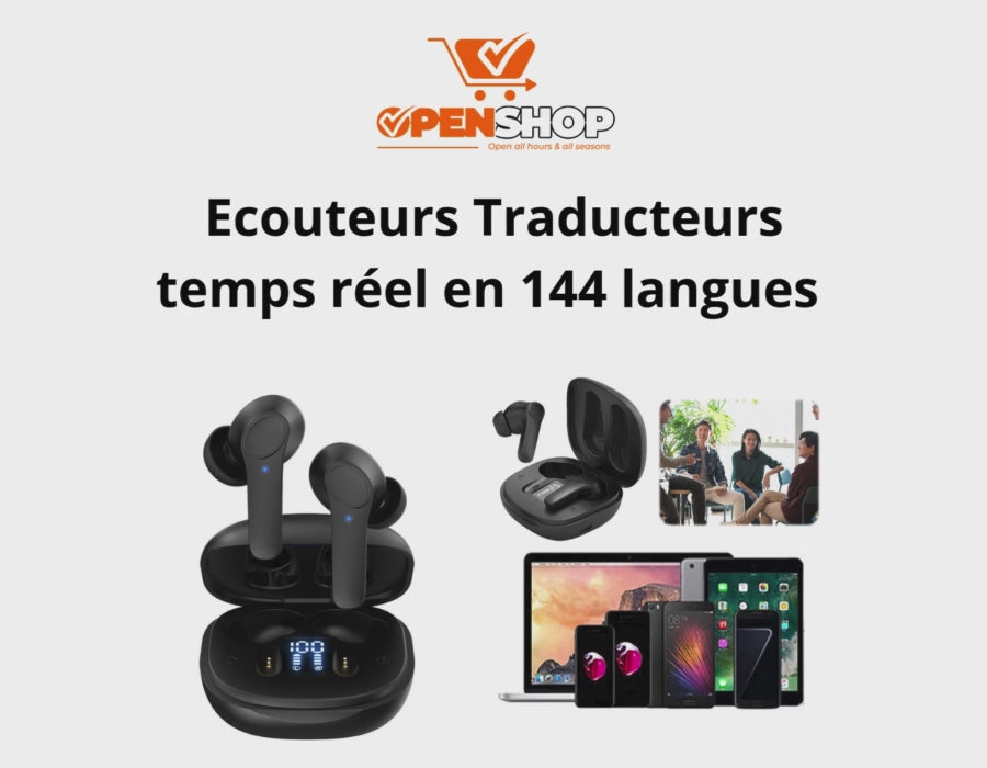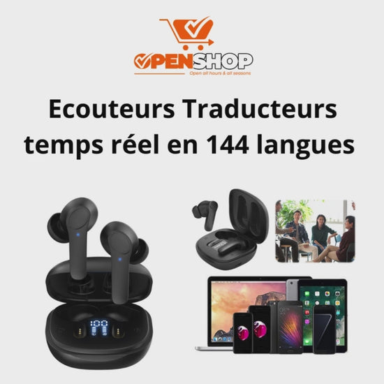 Ces écouteurs traduisent en 144 langues . Ce traducteur vocal intelligent permet une traduction instantanée avec 99% de précision. Il utilise la technologie sans fil Bluetooth avec 4 modes de traduction. C'est un traducteur casque antibruit IPX6 étanche pour le sport Voyage d'affaires.